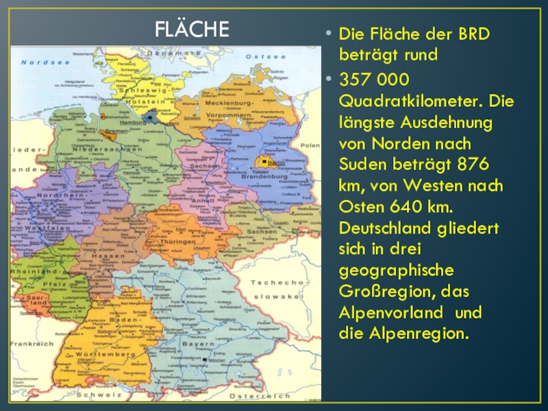 357 000 Quadratkilometer. Die längste Ausdehnung von Norden nach Suden beträgt 876 km, von Westen nach Osten 640 km. Deutschland gliedert sich in drei geographische Großregion, das Alpenvorland und die Alpenregion.