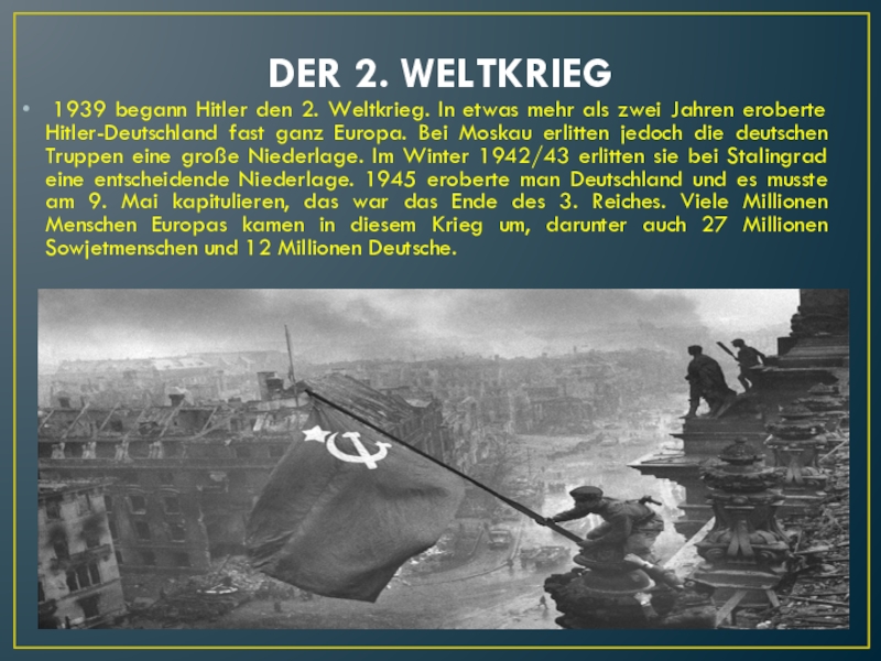 mehr als zwei Jahren eroberte Hitler-Deutschland fast ganz Europa. Bei Moskau erlitten jedoch die deutschen Truppen eine große Niederlage. Im Winter 1942/43 erlitten sie bei Stalingrad eine entscheidende Niederlage. 1945 eroberte man Deutschland und es musste am 9. Mai kapitulieren, das war das Ende des 3. Reiches. Viele Millionen Menschen Europas kamen in diesem Krieg um, darunter auch 27 Millionen Sowjetmenschen und 12 Millionen Deutsche.