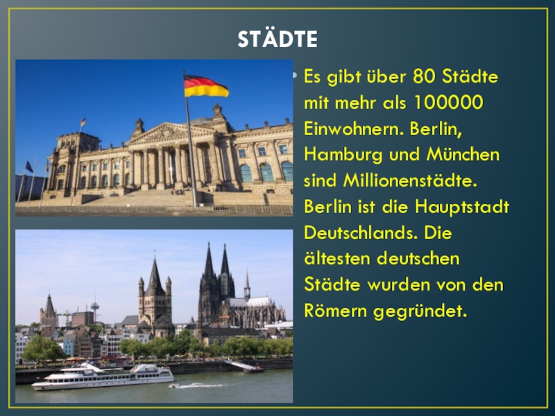 Hamburg und München sind Millionenstädte. Berlin ist die Hauptstadt Deutschlands. Die ältesten deutschen Städte wurden von den Römern gegründet.