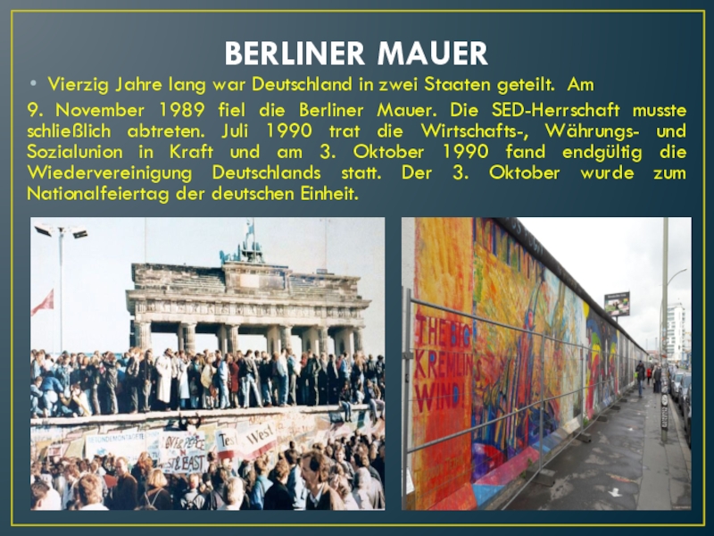 9. November 1989 fiel die Berliner Mauer. Die SED-Herrschaft musste schließlich abtreten. Juli 1990 trat die Wirtschafts-, Währungs- und Sozialunion in Kraft und am 3. Oktober 1990 fand endgültig die Wiedervereinigung Deutschlands statt. Der 3. Oktober wurde zum Nationalfeiertag der deutschen Einheit.
