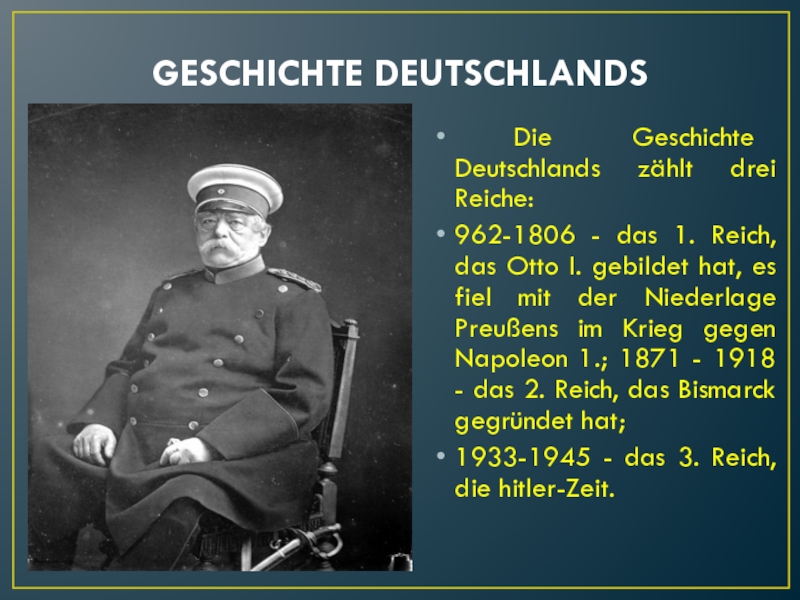 1. Reich, das Otto I. gebildet hat, es fiel mit der Niederlage Preußens im Krieg gegen Napoleon 1.; 1871 - 1918 - das 2. Reich, das Bismarck gegründet hat;