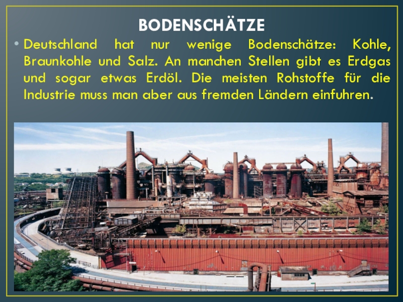 Deutschland hat nur wenige Bodenschätze: Kohle, Braunkohle und Salz. An manchen