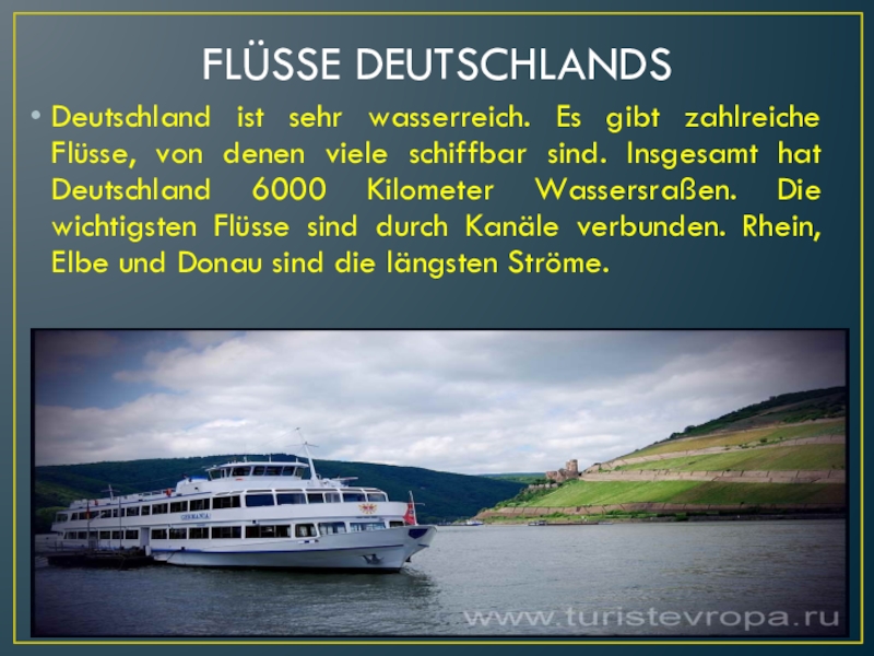 viele schiffbar sind. Insgesamt hat Deutschland 6000 Kilometer Wassersraßen. Die wichtigsten Flüsse sind durch Kanäle verbunden. Rhein, Elbe und Donau sind die längsten Ströme.
