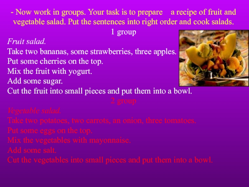 - Now work in groups. Your task is to prepare  a recipe of fruit and vegetable