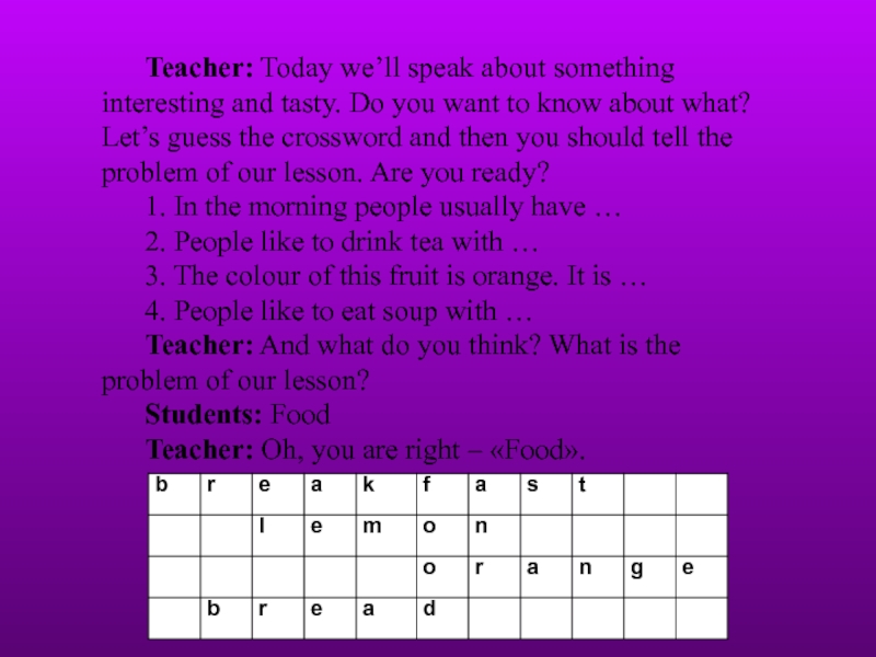 Teacher: Today we’ll speak about something interesting and tasty. Do you want to know about what? Let’s guess