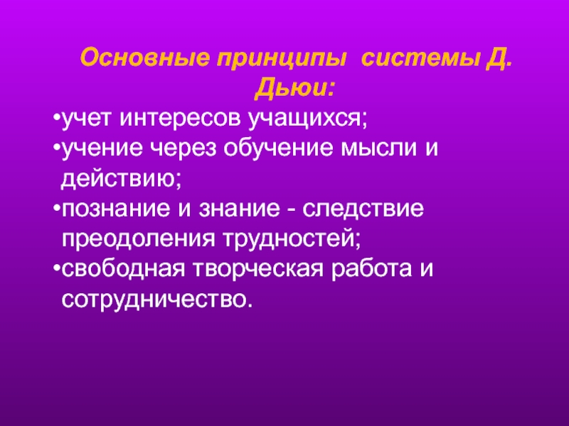 Основные принципы системы Д.Дьюи:учет интересов учащихся;учение через обучение мысли и действию;познание и знание - следствие преодоления трудностей;свободная