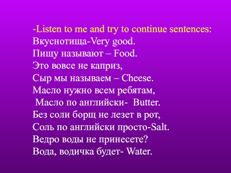 -Listen to me and try to continue sentences:Вкуснотища-Very good.Пищу называют – Food.Это вовсе не каприз, Сыр мы