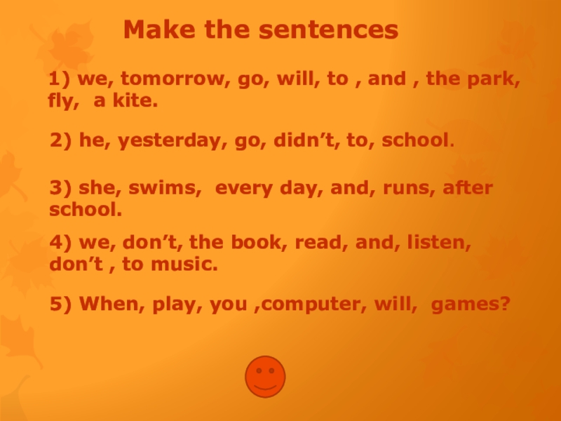 4) we, don’t, the book, read, and, listen, don’t , to music.