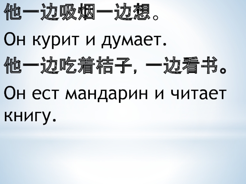 他一边吸烟一边想。Он курит и думает.他一边吃着桔子,一边看书。Он ест мандарин и читает книгу.