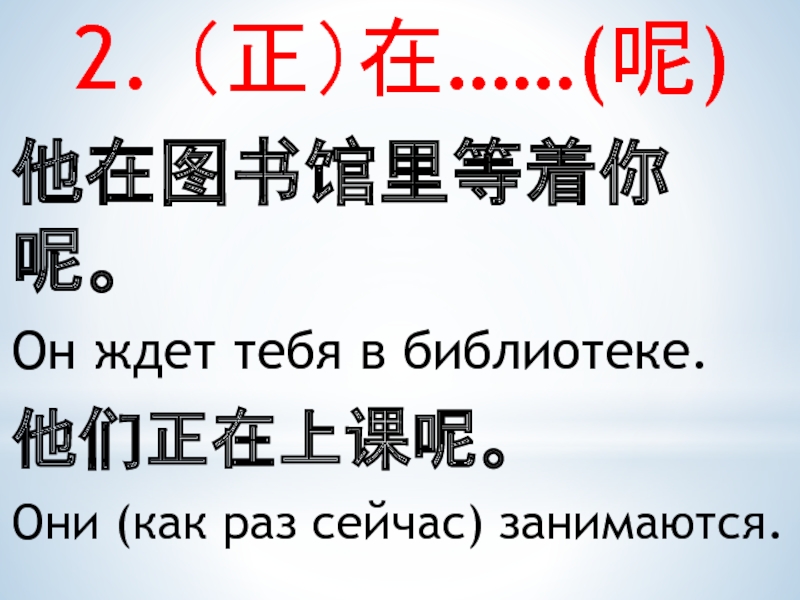 2. (正)在……(呢)他在图书馆里等着你呢。Он ждет тебя в библиотеке.他们正在上课呢。Они (как раз сейчас) занимаются.