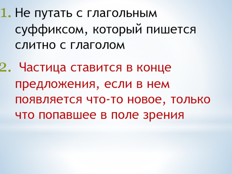 Не путать с глагольным суффиксом, который пишется слитно с глаголом Частица ставится в конце предложения, если в