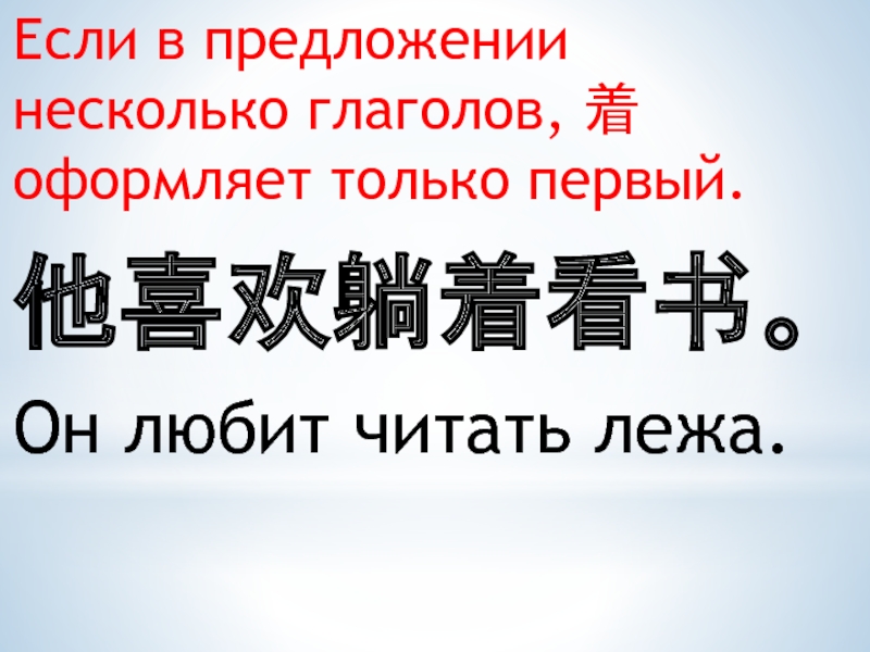 Если в предложении несколько глаголов, 着 оформляет только первый.他喜欢躺着看书。Он любит читать лежа.