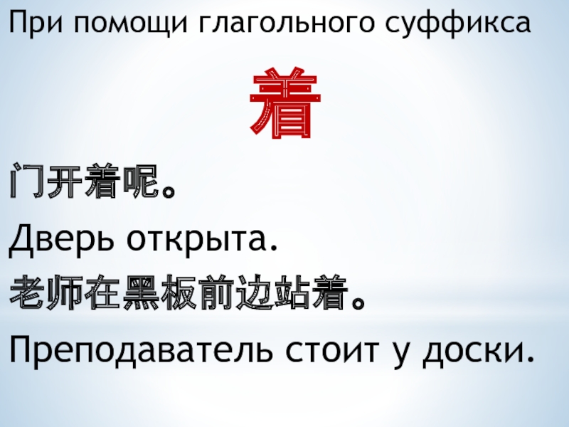 При помощи глагольного суффикса 着门开着呢。Дверь открыта.老师在黑板前边站着。Преподаватель стоит у доски.