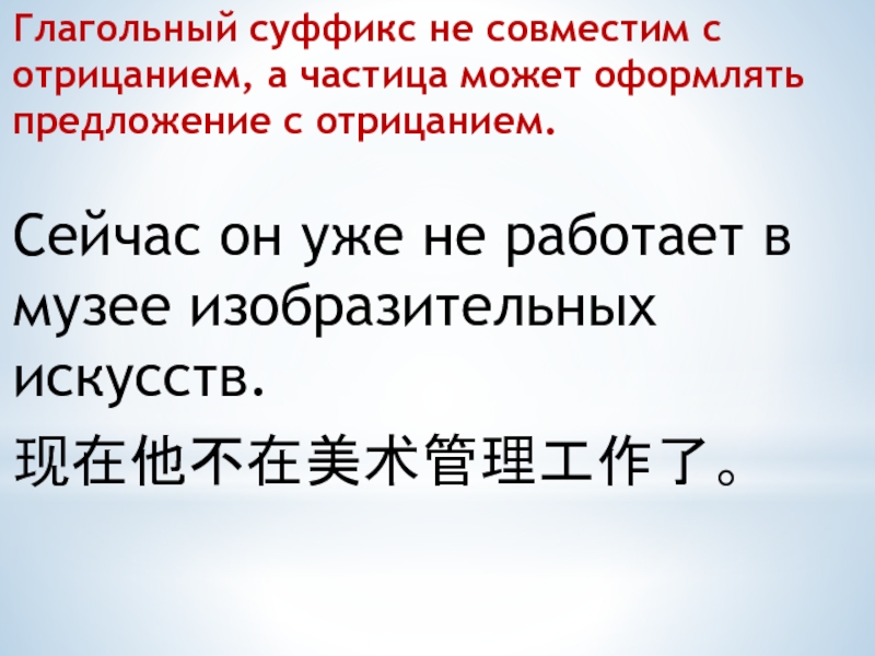 Слайд 14Глагольный суффикс не совместим с отрицанием, а частица может оформлять предложение