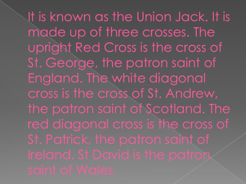 of three crosses. The upright Red Cross is the cross of St. George, the patron saint of England. The white diagonal cross is the cross of St. Andrew, the patron saint of Scotland. The red diagonal cross is the cross of St. Patrick, the patron saint of Ireland. St David is the patron saint of Wales.