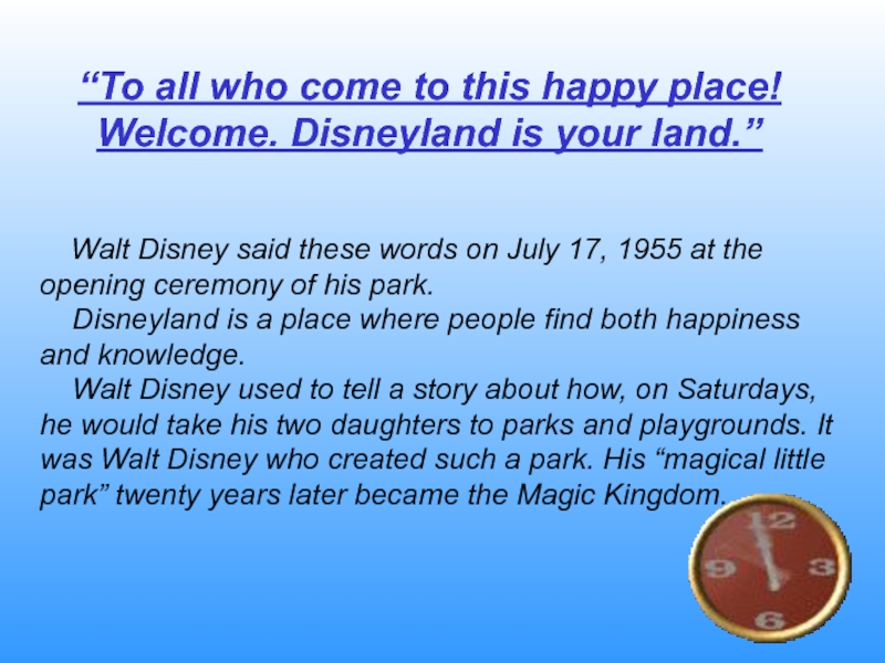 Слайд 7“To all who come to this happy place! Welcome. Disneyland is