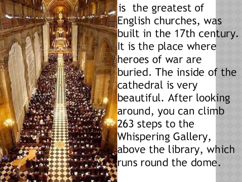 the 17th century. It is the place where heroes of war are buried. The inside of the cathedral is very beautiful. After looking around, you can climb 263 steps to the Whispering Gallery, above the library, which runs round the dome.