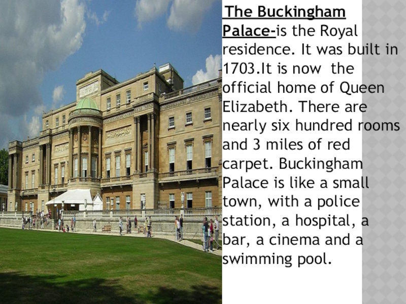 in 1703.It is now the official home of Queen Elizabeth. There are nearly six hundred rooms and 3 miles of red carpet. Buckingham Palace is like a small town, with a police station, a hospital, a bar, a cinema and a swimming pool.