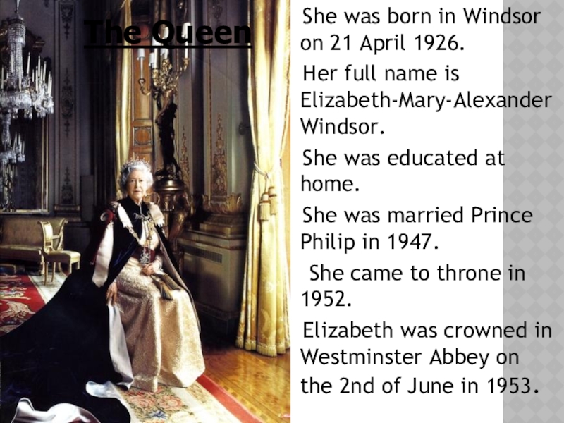 Слайд 20 She was born in Windsor on 21 April 1926.