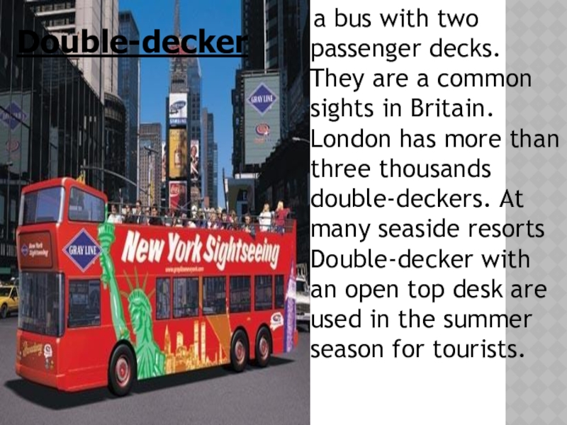 common sights in Britain. London has more than three thousands double-deckers. At many seaside resorts Double-decker with an open top desk are used in the summer season for tourists.