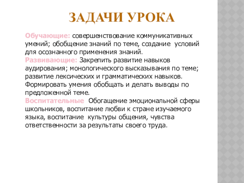 Слайд 3Обучающие: совершенствование коммуникативных умений; обобщение знаний по теме, создание условий для осознанного