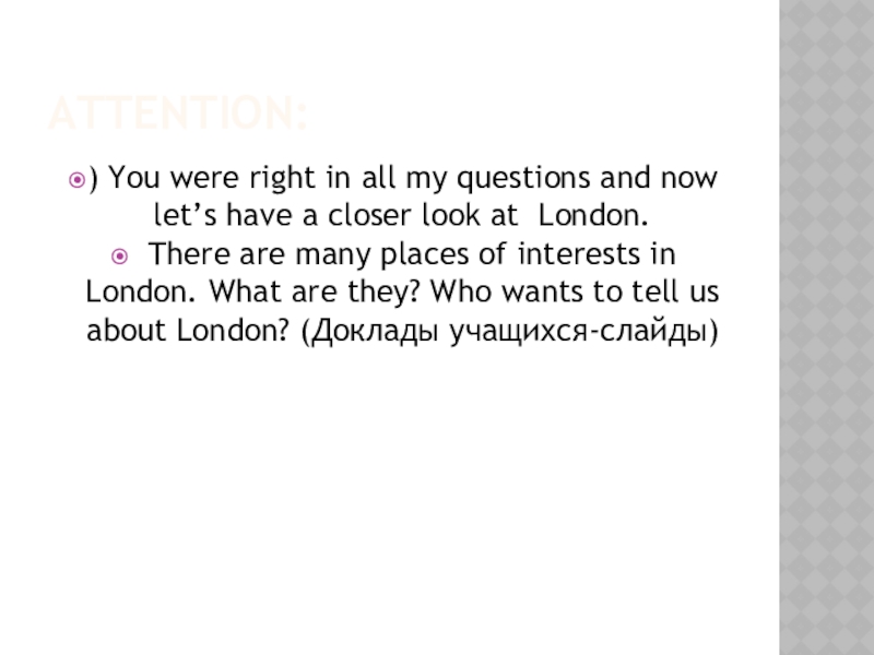 There are many places of interests in London. What are they? Who wants to tell us about London? (Доклады учащихся-слайды)
