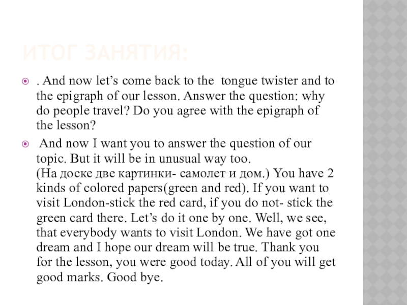And now I want you to answer the question of our topic. But it will be in unusual way too. (На доске две картинки- самолет и дом.) You have 2 kinds of colored papers(green and red). If you want to visit London-stick the red card, if you do not- stick the green card there. Let’s do it one by one. Well, we see, that everybody wants to visit London. We have got one dream and I hope our dream will be true. Thank you for the lesson, you were good today. All of you will get good marks. Good bye.