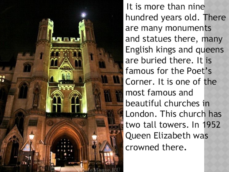 are many monuments and statues there, many English kings and queens are buried there. It is famous for the Poet’s Corner. It is one of the most famous and beautiful churches in London. This church has two tall towers. In 1952 Queen Elizabeth was crowned there.