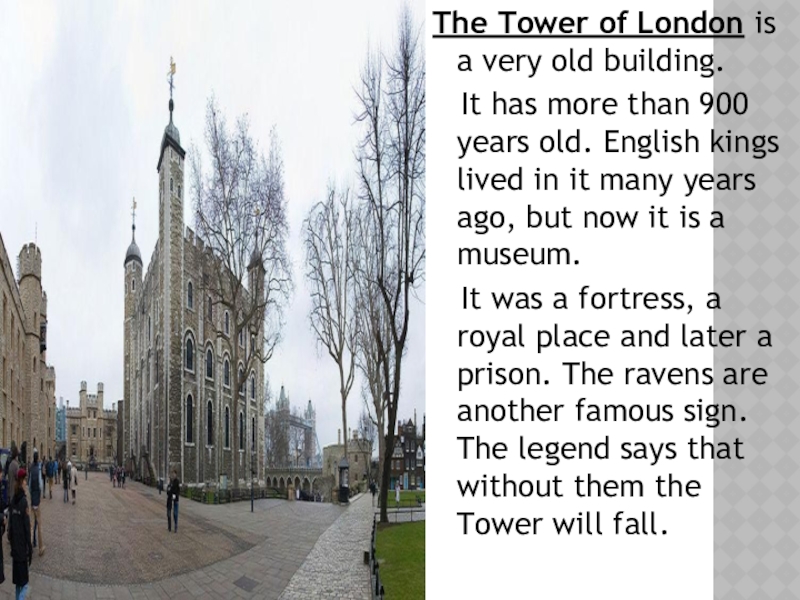 It was a fortress, a royal place and later a prison. The ravens are another famous sign. The legend says that without them the Tower will fall.
