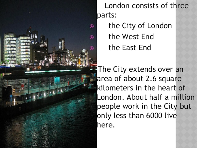 The City extends over an area of about 2.6 square kilometers in the heart of London. About half a million people work in the City but only less than 6000 live here.