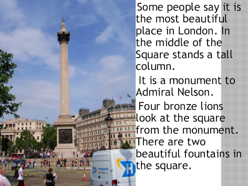 Four bronze lions look at the square from the monument. There are two beautiful fountains in the square.