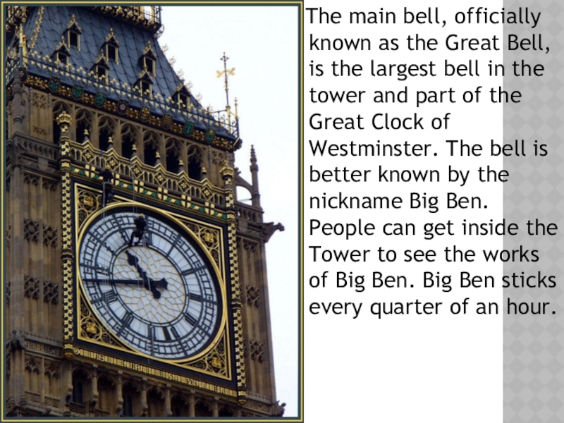 the largest bell in the tower and part of the Great Clock of Westminster. The bell is better known by the nickname Big Ben. People can get inside the Tower to see the works of Big Ben. Big Ben sticks every quarter of an hour.