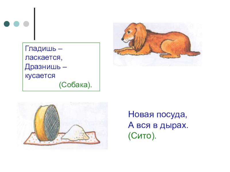 Гладишь – ласкается,Дразнишь – кусается        (Собака).Новая посуда,А вся в дырах.