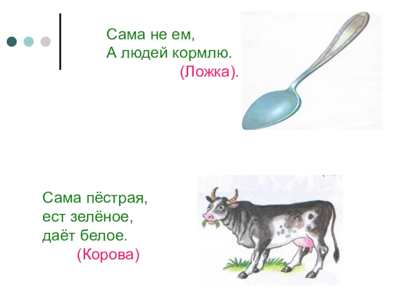 Сама пёстрая, ест зелёное,даёт белое.     (Корова)Сама не ем,А людей кормлю.