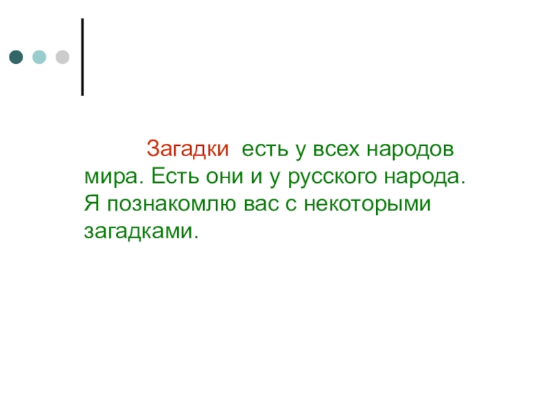 Загадки есть у всех народов мира. Есть они и у русского народа. Я познакомлю вас с некоторыми загадками.