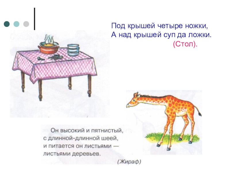 Под крышей четыре ножки,А над крышей суп да ложки.