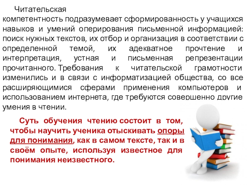 Суть обучения чтению состоит в том, чтобы научить ученика отыскивать опоры для понимания, как в самом тексте, так и в своём опыте, используя известное для понимания неизвестного.