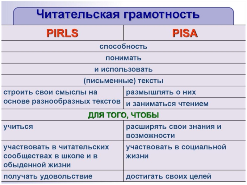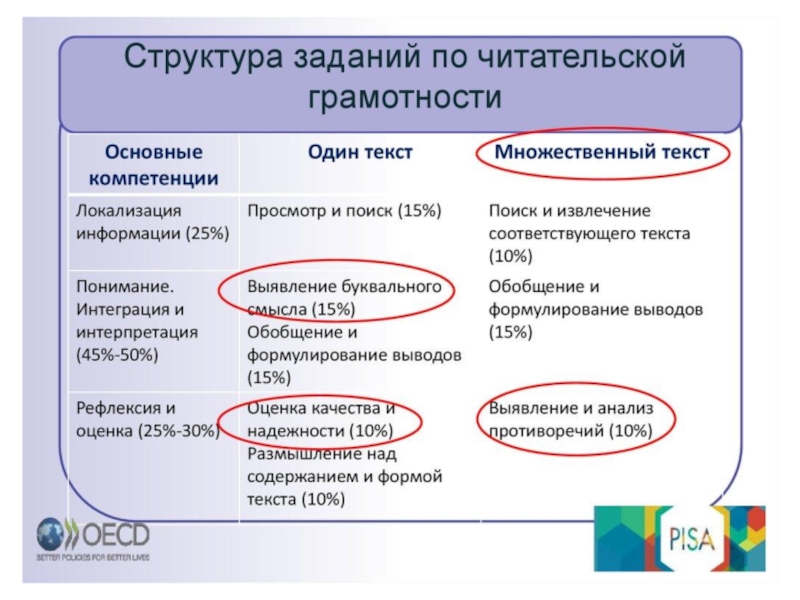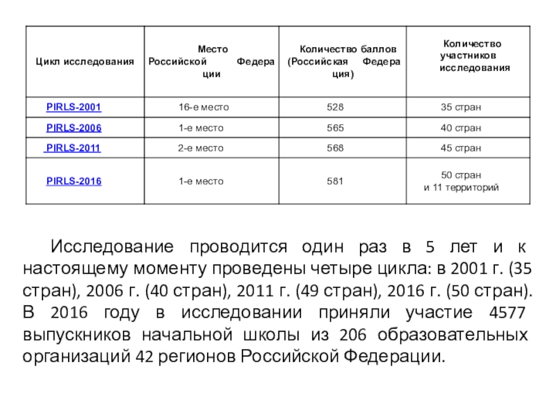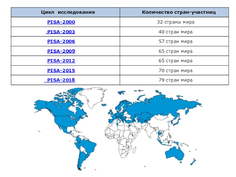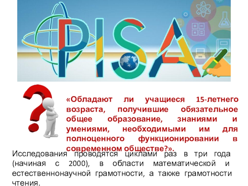 Исследования проводятся циклами раз в три года (начиная с 2000), в области математической и естественнонаучной грамотности, а также грамотности чтения.
