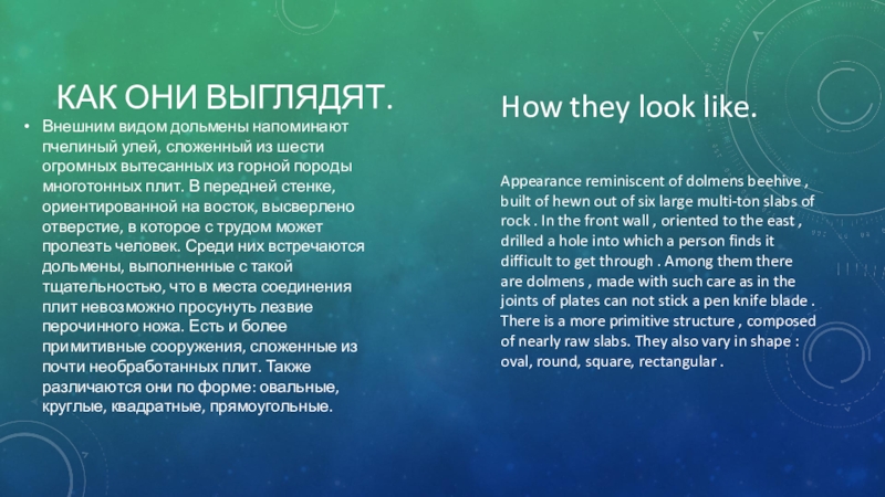 Appearance reminiscent of dolmens beehive , built of hewn out of six large multi-ton slabs of rock . In the front wall , oriented to the east , drilled a hole into which a person finds it difficult to get through . Among them there are dolmens , made with such care as in the joints of plates can not stick a pen knife blade . There is a more primitive structure , composed of nearly raw slabs. They also vary in shape : oval, round, square, rectangular .
