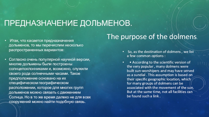 • According to the scientific version of the very popular , many dolmens were built sun-worshipers and may have served as a sundial . This assumption is based on their specific geographic location, which for many groups of dolmens can be associated with the movement of the sun. But at the same time, not all facilities can be found such a link .