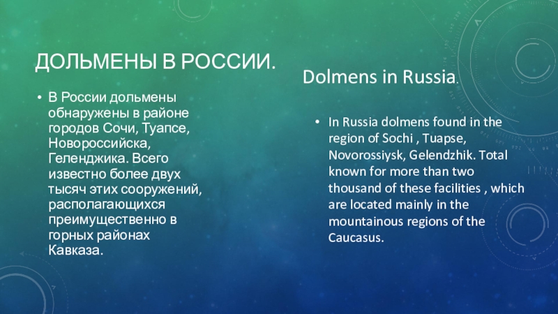 In Russia dolmens found in the region of Sochi , Tuapse, Novorossiysk, Gelendzhik. Total known for more than two thousand of these facilities , which are located mainly in the mountainous regions of the Caucasus.