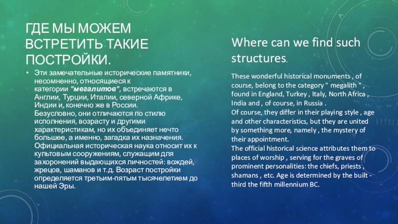 These wonderful historical monuments , of course, belong to the category " megalith " , found in England, Turkey , Italy, North Africa , India and , of course, in Russia .