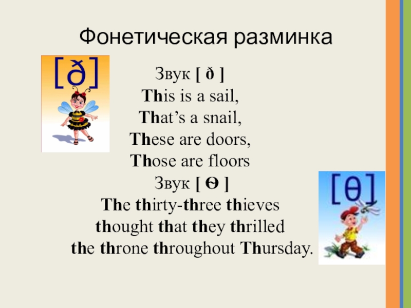 Фонетическая разминкаЗвук [ ð ]This is a sail,That’s a snail,These are doors,Those are floors  Звук [ Ѳ ]The thirty-three thieves thought that they thrilled the throne throughout Thursday.