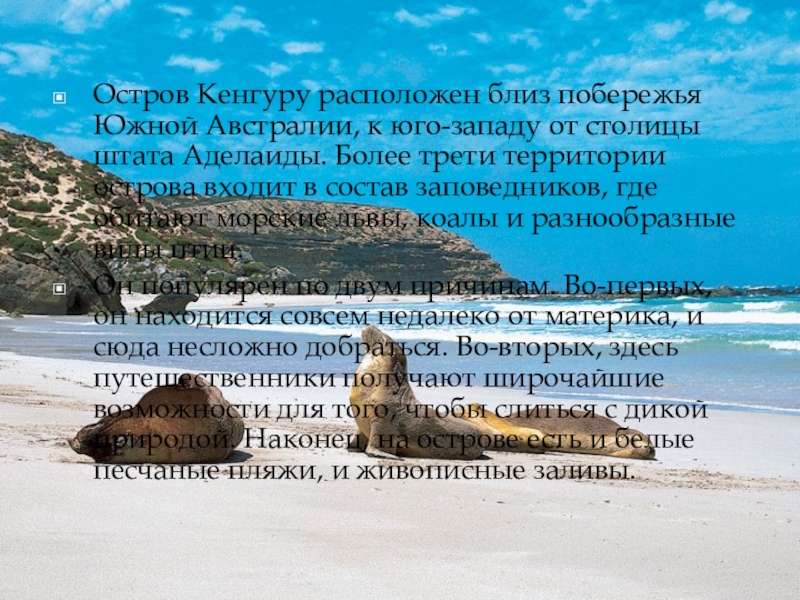 Слайд 11Остров Кенгуру расположен близ побережья Южной Австралии, к юго-западу от столицы