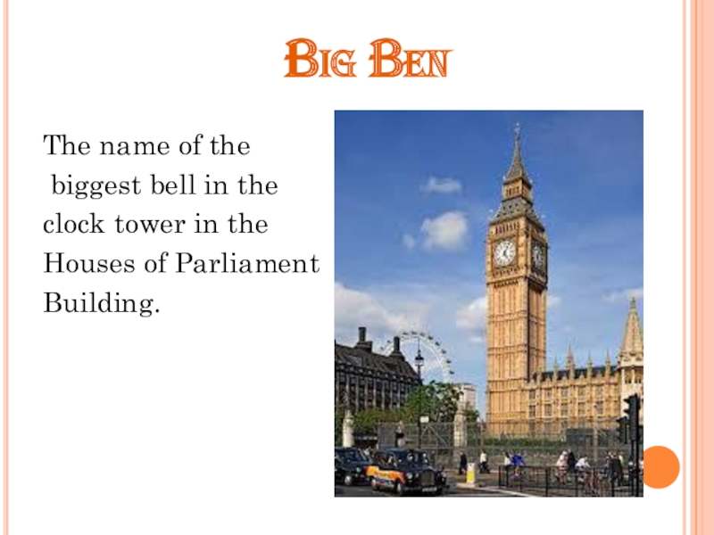 Big BenThe name of the biggest bell in the clock tower in the Houses of Parliament Building.