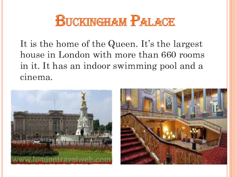 Buckingham PalaceIt is the home of the Queen. It’s the largest house in London with more than