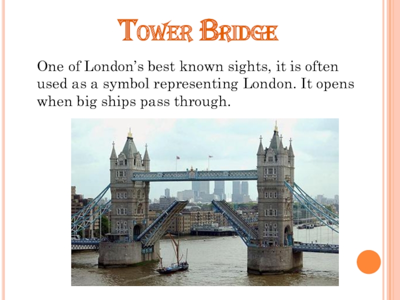 Tower BridgeOne of London’s best known sights, it is often used as a symbol representing London. It
