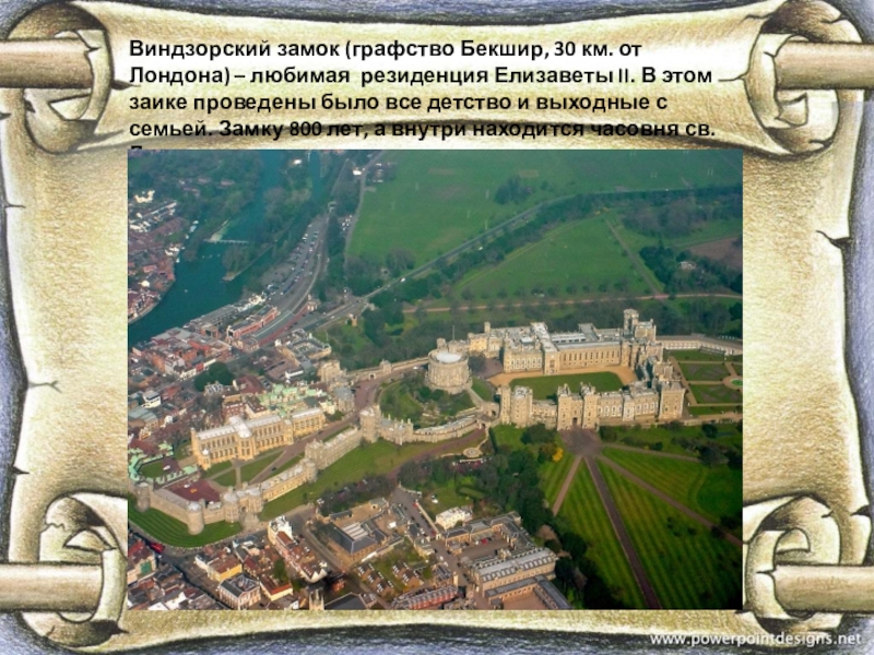 Слайд 10Виндзорский замок (графство Бекшир, 30 км. от Лондона) – любимая резиденция Елизаветы