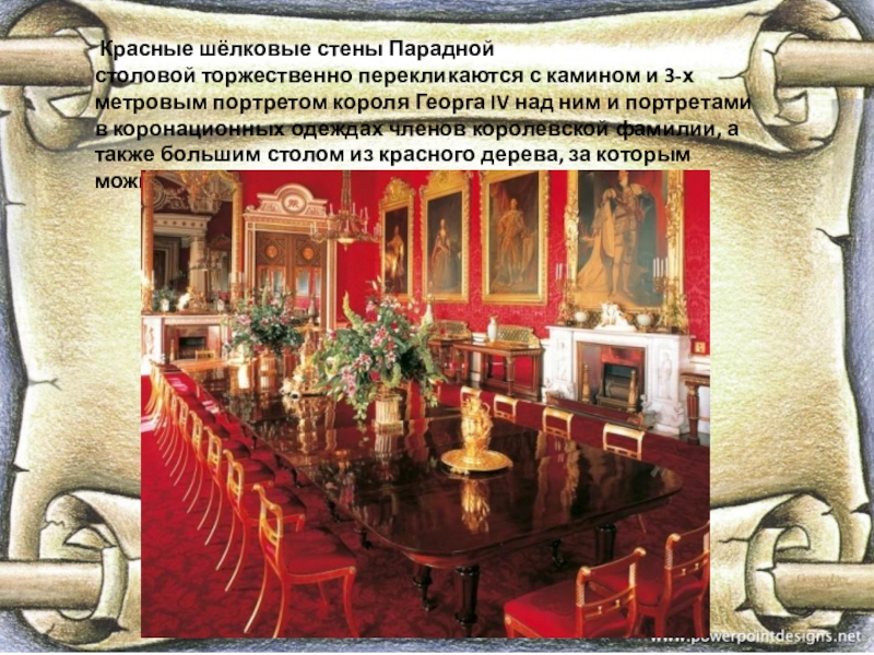 Слайд 8 Красные шёлковые стены Парадной столовой торжественно перекликаются с камином и 3-х метровым