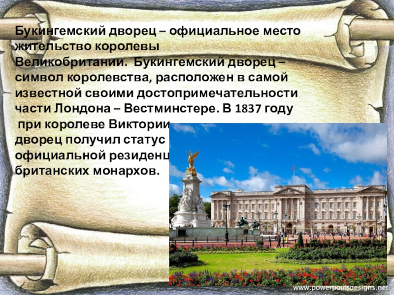 Букингемский дворец – официальное место жительство королевы Великобритании.  Букингемский дворец – символ королевства, расположен в самой известной своими достопримечательности части Лондона – Вестминстере. В 1837 году при королеве Виктории дворец получил статус официальной резиденции британских монархов.